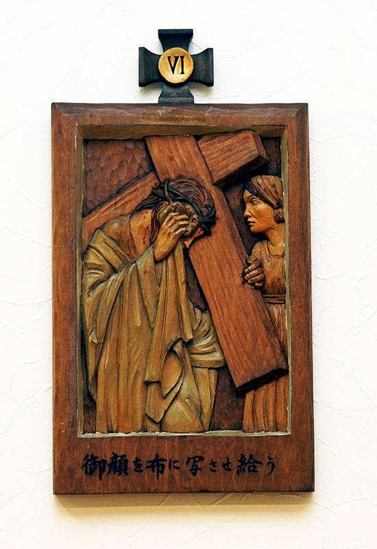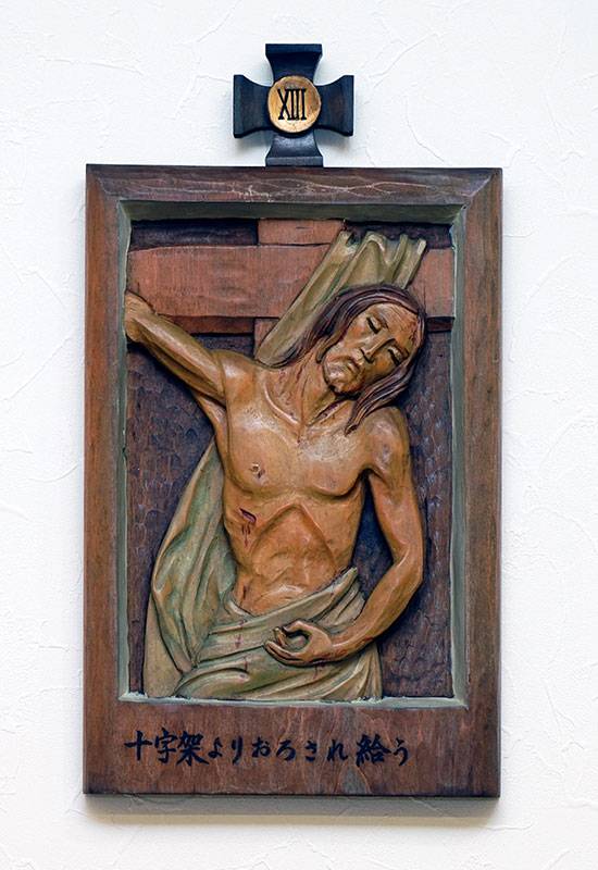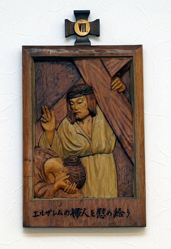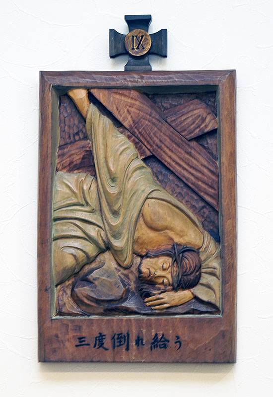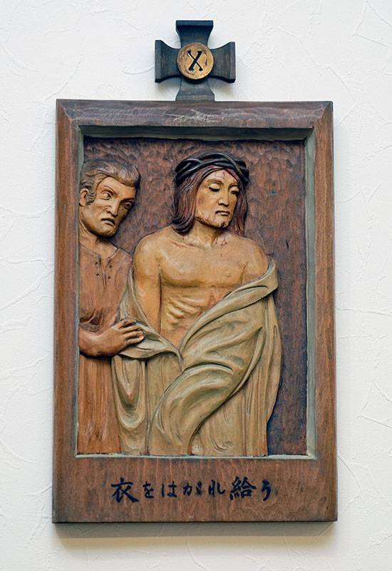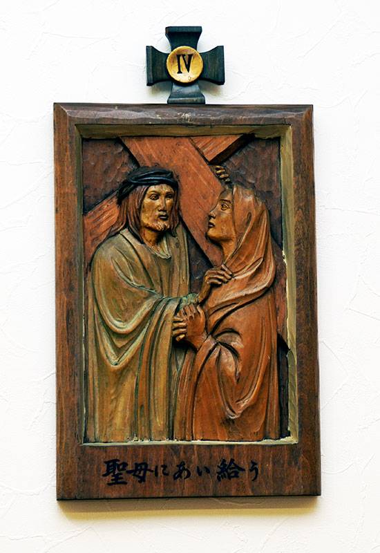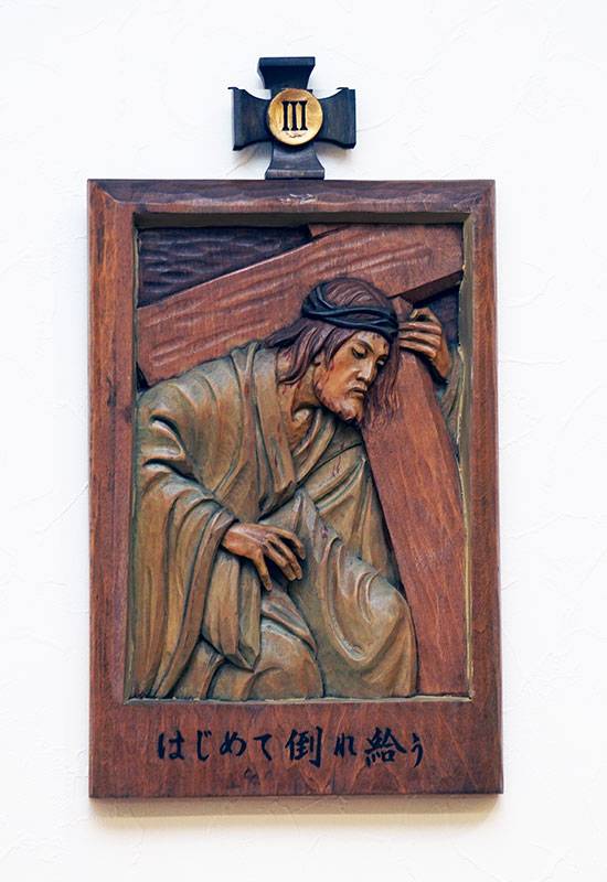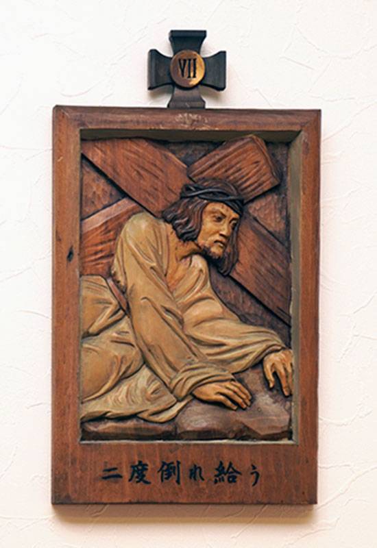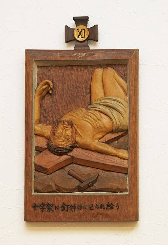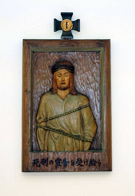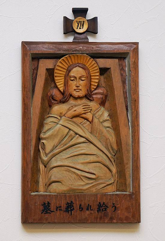 聖堂の壁面には「十字架の道行き」が架けられています。これは、キリストがピラトから死刑の宣告を受けられてから十字架上で亡くなられ葬られるまでの14の留(りゅう)を追体験し、その受難を黙想するためのものです。